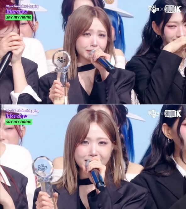 Upon being announced as this week's #1 winners, nearly all of the members of SAY MY NAME broke into tears of joy. Amidst the tears and emotions, leader Hitomi took the trophy and the mic to relay the group's acceptance speech. She said, "This is the first time since our debut that we've won first place. I can't believe that the moment that we've always dreamed of since debut has actually come. It is such an honor to achieve such a meaningful feat on the first 'Music Bank' broadcast of the year. I believe that this trophy was possible only because of all those who helped us, supported us, and loved us. I would like to take this time to express our sincerest gratitude to all of you."