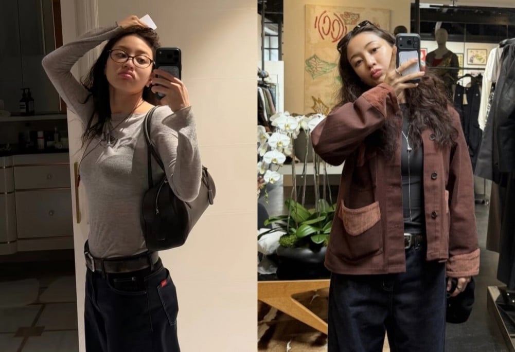 In the images, she is seen taking mirror selfies while wearing glasses, paired with a simple T-shirt, jeans, and a leather bag, creating a relaxed and approachable look. Another photo shows her posing naturally in what appears to be a clothing store, dressed in a casual jacket and wide-leg pants.