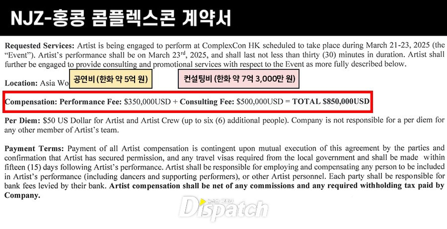 Dispatch claims to have obtained the contract between NewJeans and ComplexCon Hong Kong. The group’s appearance fee was 350,000 USD. Consulting fees were reportedly 500,000 USD, including staff expenses. In total, NewJeans were paid 850,000 USD.