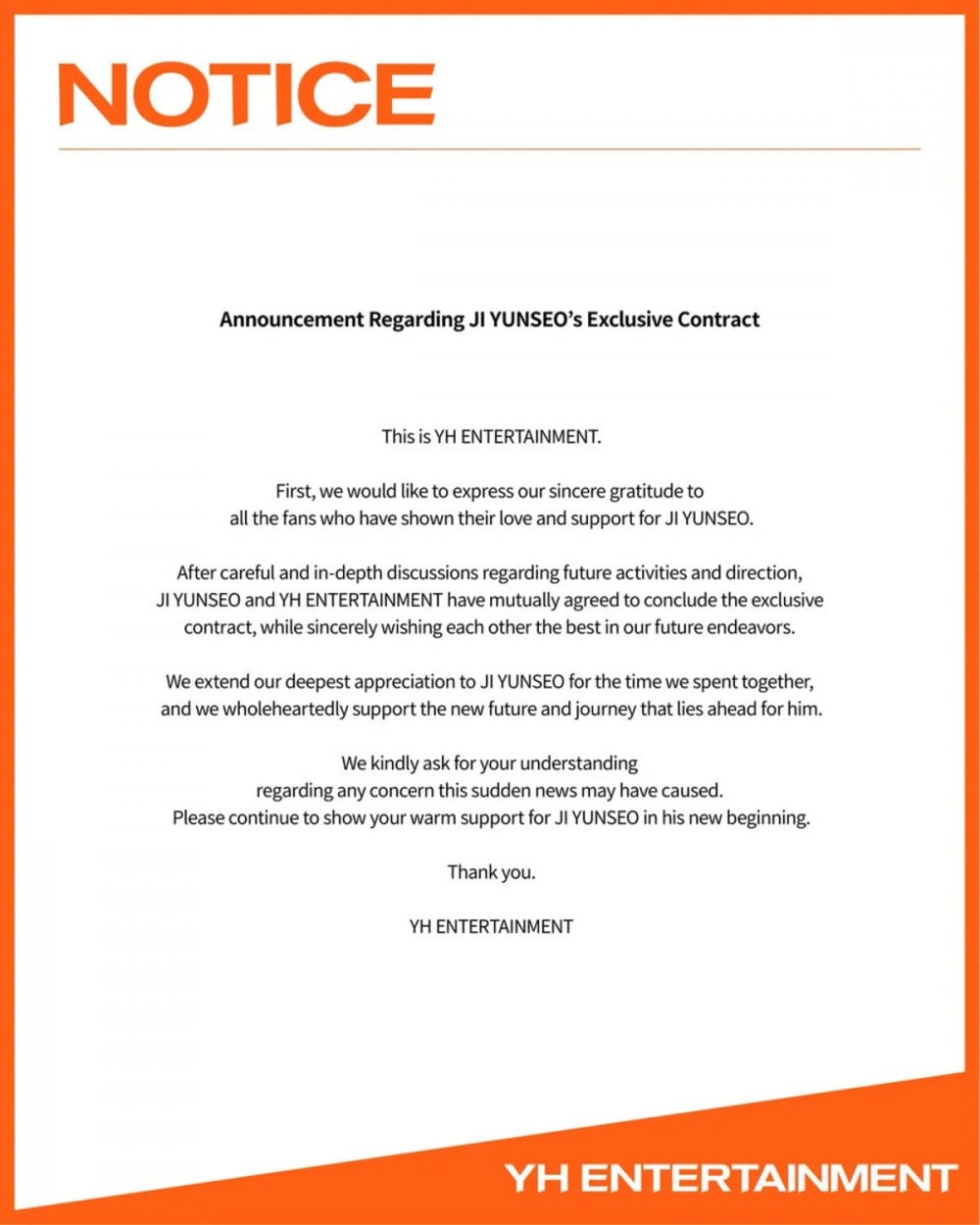 On February 13, YH Entertainment released a statement announcing that the company and Ji Yunseo have mutually agreed to conclude his exclusive contract.