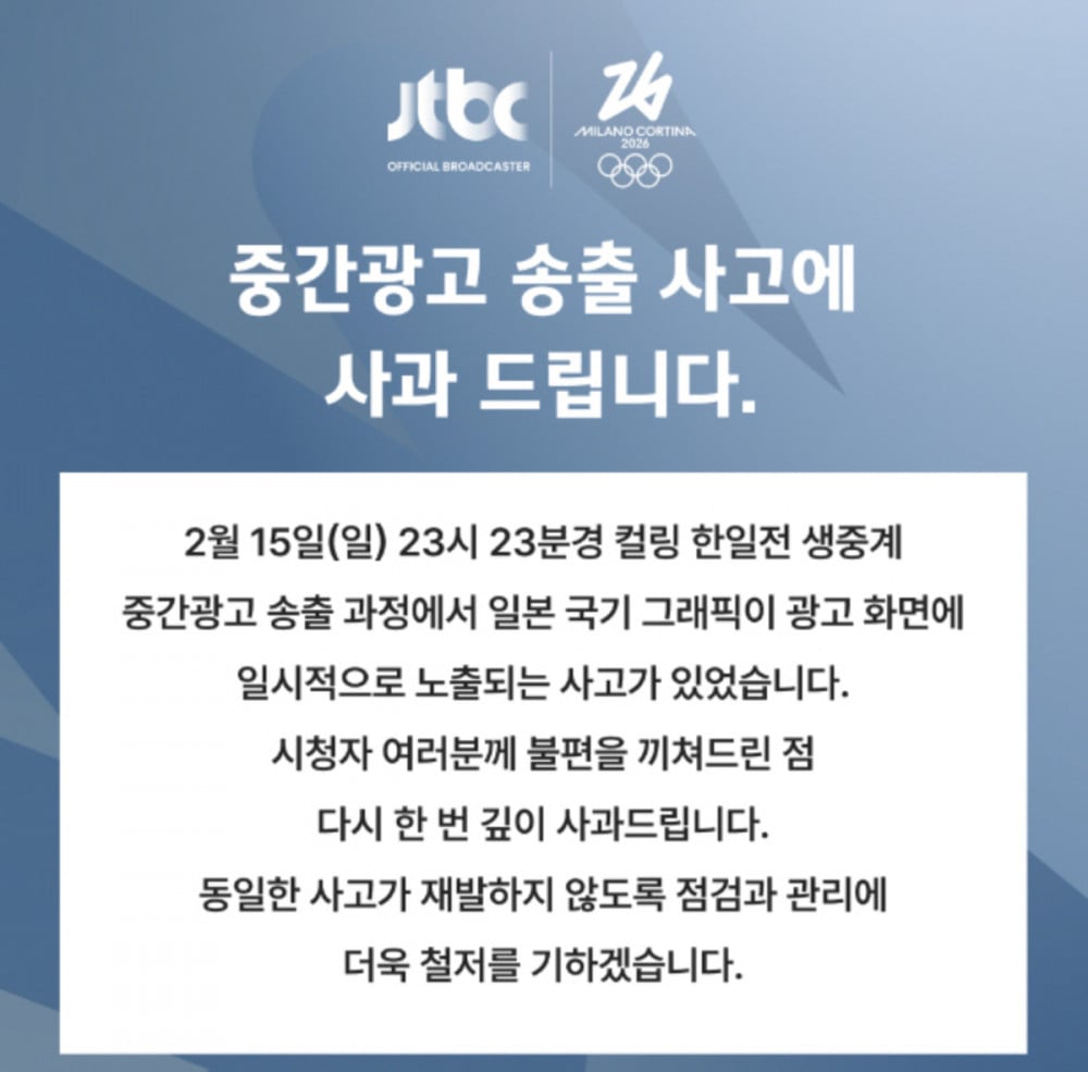 On February 16, JTBC posted a statement on its official website addressing the incident. The network explained, “At approximately 11:23 p.m. on February 15, during a live curling broadcast, a Japanese national flag graphic was briefly exposed during a commercial break.”