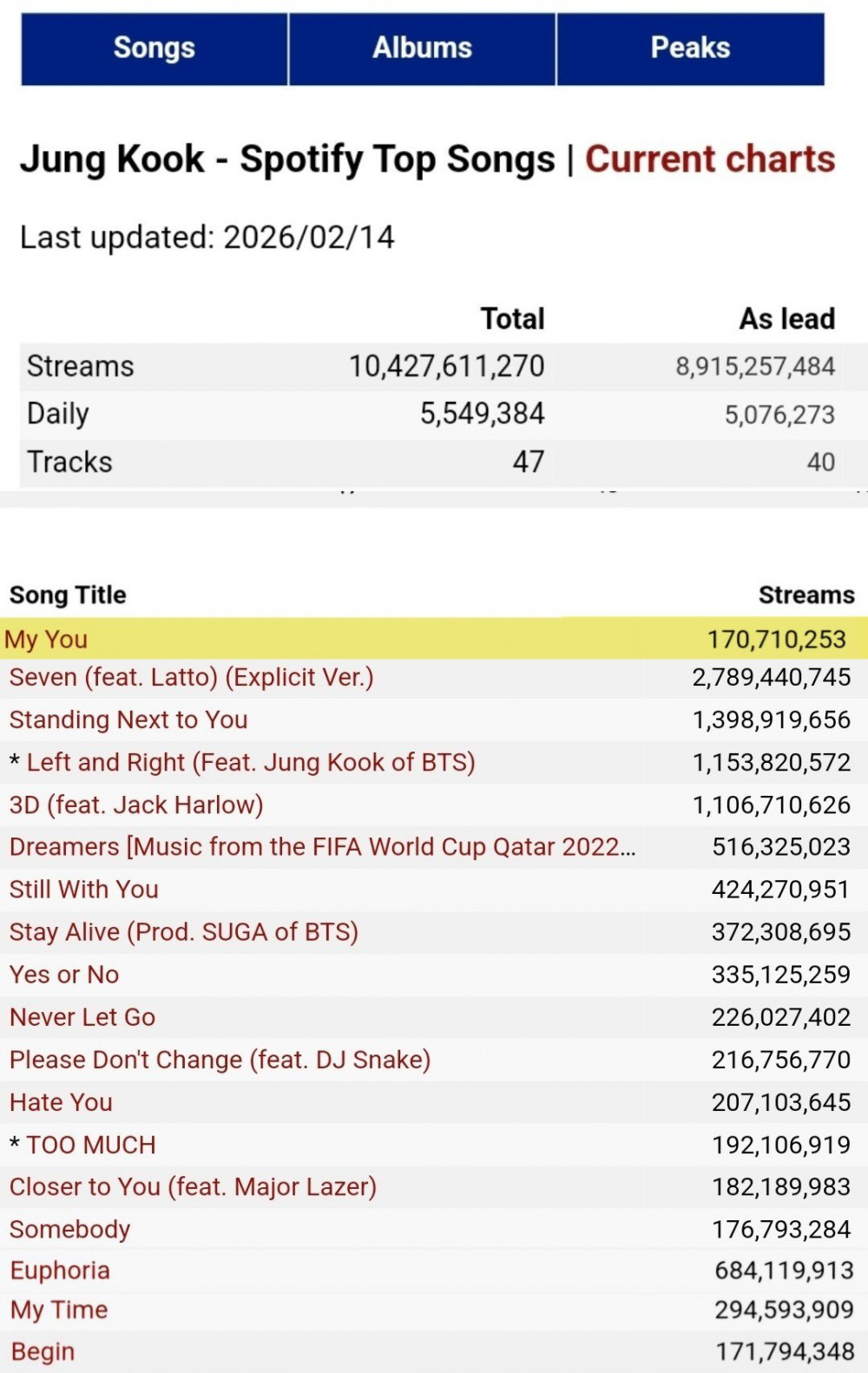 This marks Jungkook’s 18th track to exceed 170 million streams on Spotify as a soloist. “My You” was originally released for free in celebration of BTS’s 9th debut anniversary as a tribute to fans. Although it was officially released later as a digital single, the track has continued to gain steady streams, demonstrating long-term popularity on the global platform.