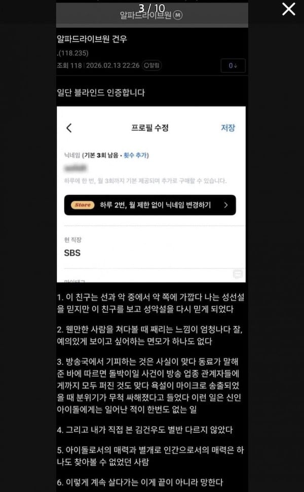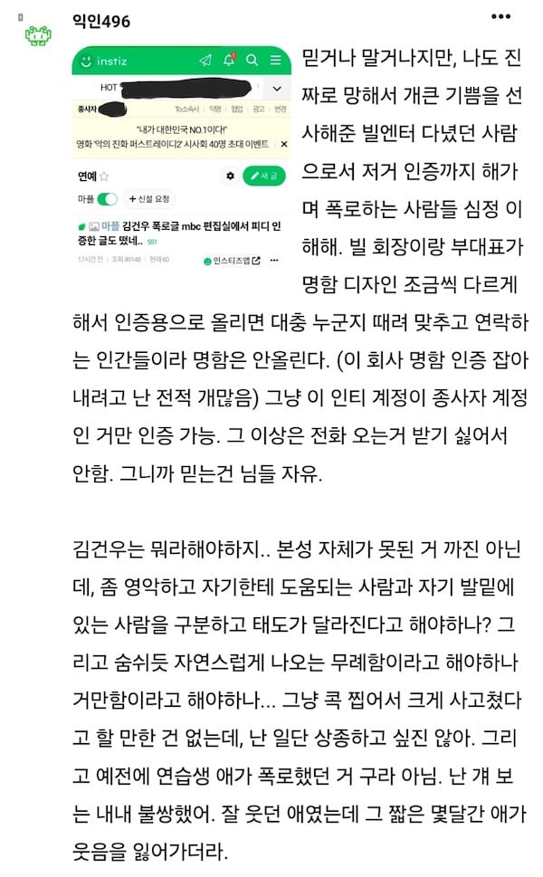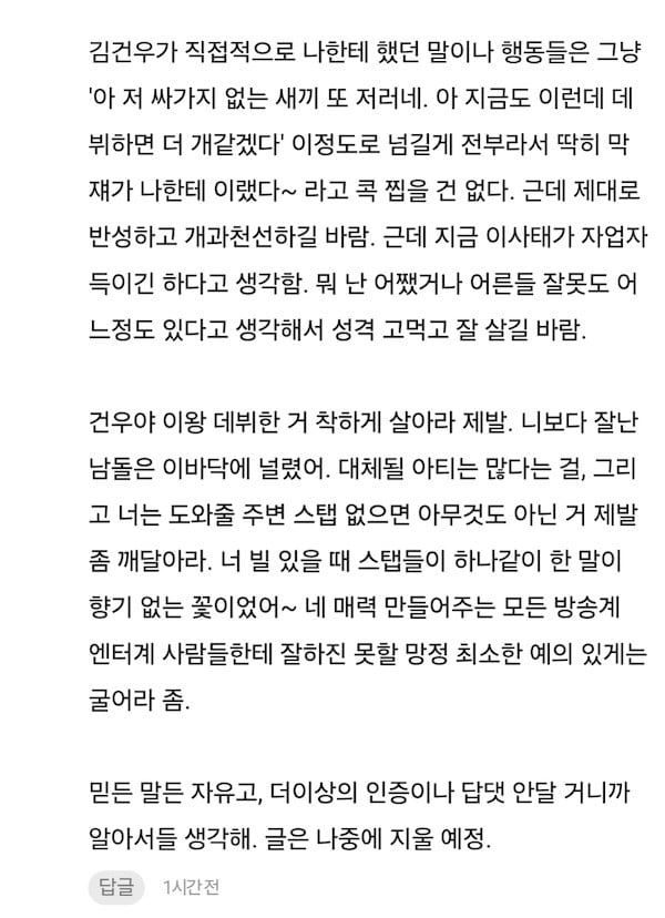 "You can choose to believe me or not, but I understand how those other people feel and why they went to such lengths to accuse him of his past misbehavior. Kim Geon Woo.. it's not necessarily that he's a rotten apple to the core. It's more like he's crafty. Should I say that he treats the people whom he considers helpful to him and people whom he considers below him very differently? Also he has this way of just being plain rude on a daily basis, I'm not sure if it comes from some kind of arrogance or what. Btw, everything that the former trainee accused him of that one time, it's all true. I always felt so bad watching that trainee (a previous bullying accuser). They used to smile all the time, but in a matter of months, they lost that smile completely.