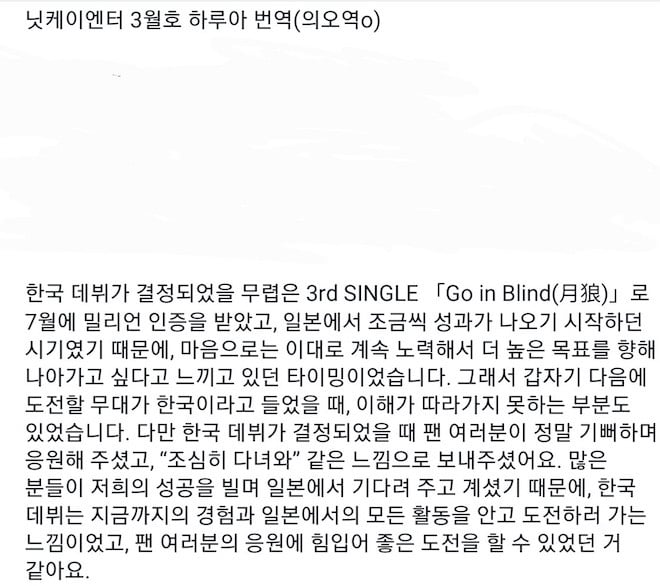 It has always been my dream since my trainee days to become a singer loved by many fans. Because of that, when I heard that we would be debuting in Korea, instead of feeling happy, I think I was more concerned by the weight and pressure of it all, whether I was ready to stand on a new and unfamiliar stage, whether I could show fans that I'd grown in the last 3 years. I wasn't able to organize my haphazard thoughts well in my interview response, and as a result, I made some LUNÉ feel like I did not take our Korean debut seriously, or I thought of it as only a step in our success in Japan. I'm sorry about that.