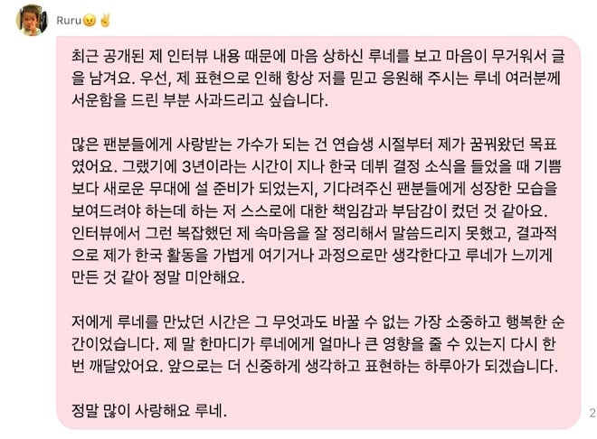 "I've decided to leave a post, as my heart is heavy knowing that some LUNÉ (&TEAM's official fan club) were hurt by my words in a recent interview. First and foremost, I want to apologize for disappointing LUNÉ, our fans who always trust and support me, with my choice of words.