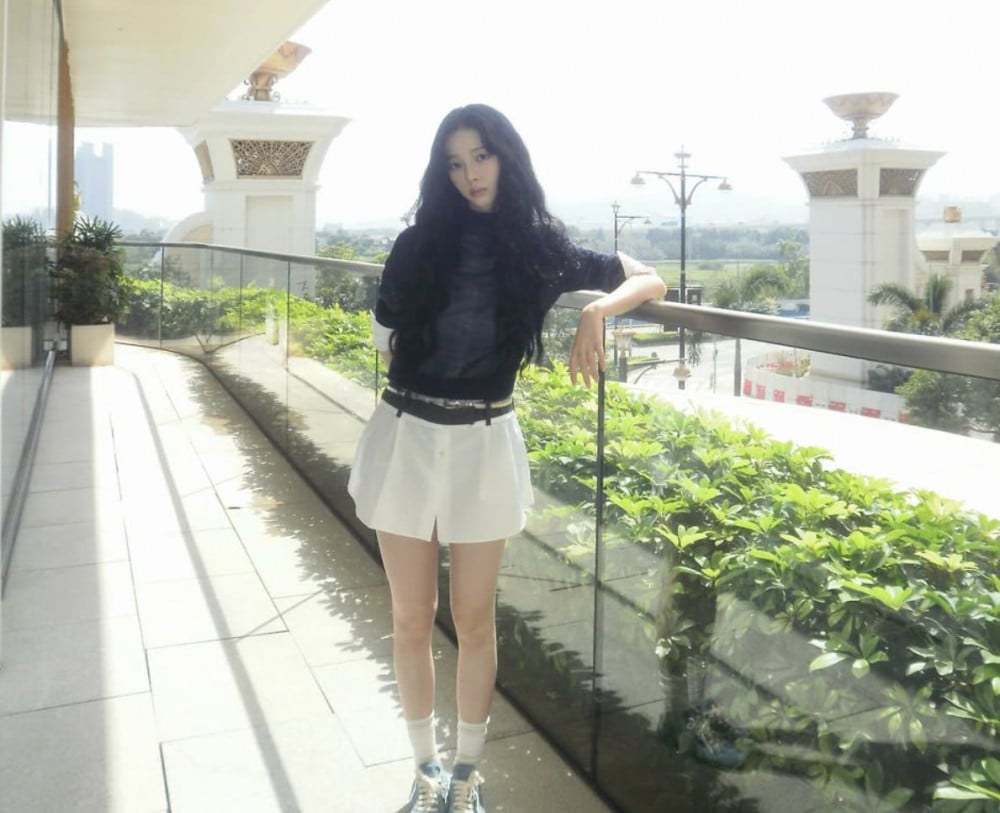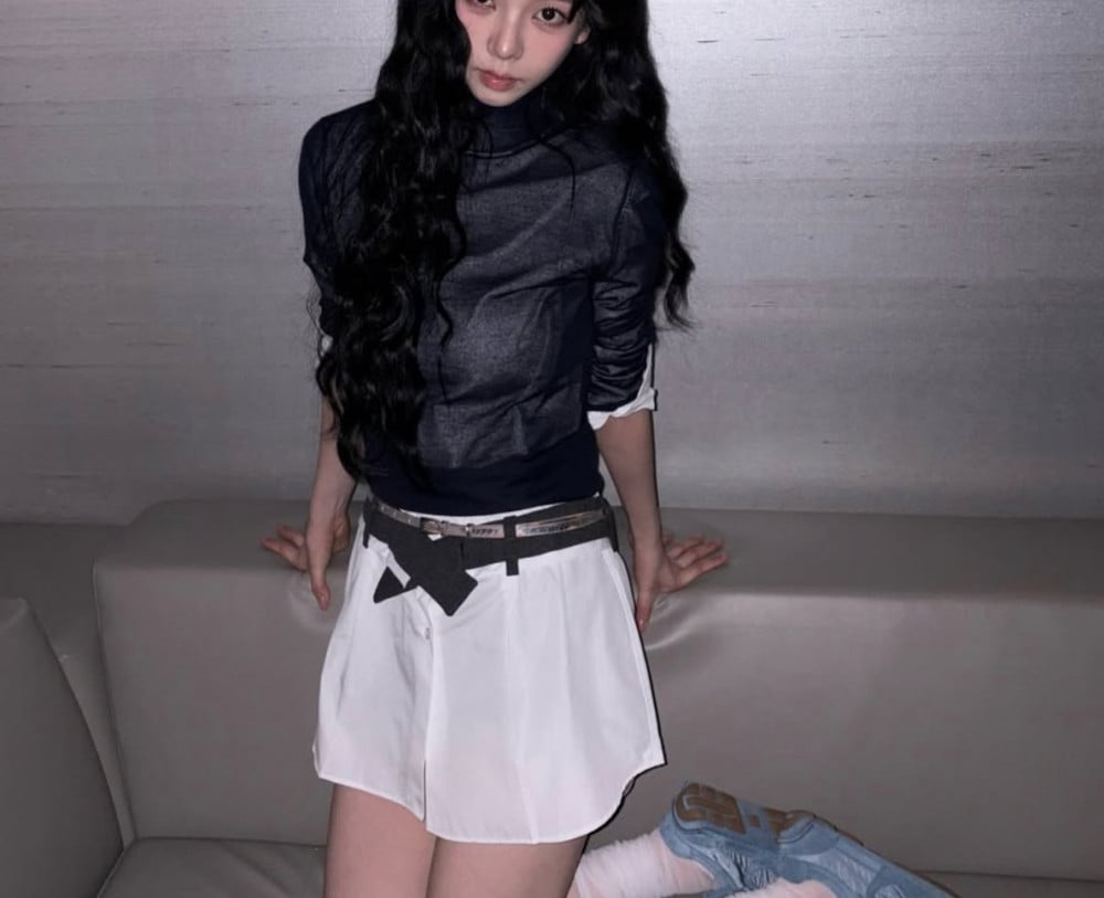 One look that caught fans’ attention was her bold “no pants” style outfit created through layered shirts. Karina wore a white shirt layered with a dark navy toned sheer top, accentuating her waistline with a slim belt. The look highlighted her long legs beneath the oversized shirt, completing a classic “no pants” fashion style.