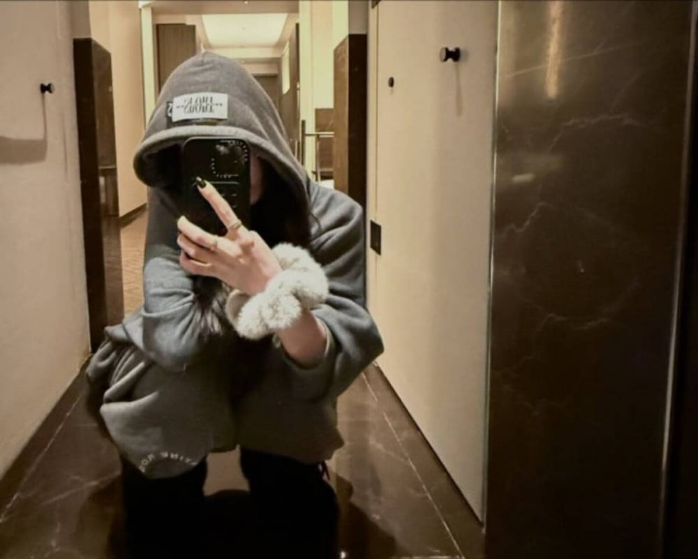 In another photo, Annie squats in front of a hallway mirror, the hood of her gray hoodie pulled over her head. She wears dark pants and a hair scrunchie with fur details on her wrist, holding her phone to take a mirror selfie. The hallway features dark marble-like flooring and walls, with doors and handles on either side, further emphasizing the understated elegance of her surroundings. Fans responded enthusiastically, leaving comments such as, “So pretty,” “Always cheering for you,” “This is my style,” and “College student Annie is so cute.”