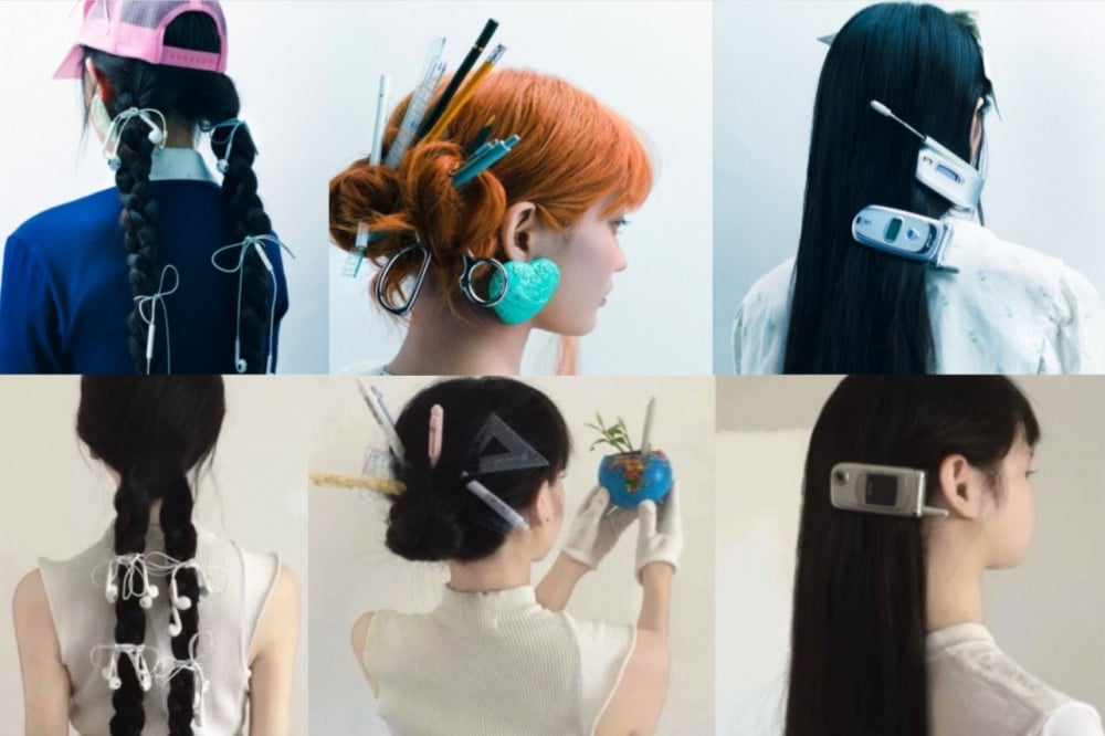 In one image, long dark braids have old school earbuds woven into them, closely resembling a similar style seen on Ali Express. In another, school supplies such as rulers and pens are placed in the hair, while silver flip phones are clipped onto long straight hair like accessories.