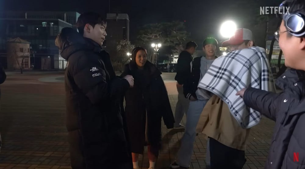 The video begins with a scene set on a rainy night in front of a tavern. While filming the moment, Seo In Guk and Jisoo, who were working together for the first time, naturally joked around and commented that their chemistry felt comfortable. Seo In Guk also showed his considerate side by helping Jisoo stand up and playfully teasing her in dialect, further showcasing their natural on screen chemistry.