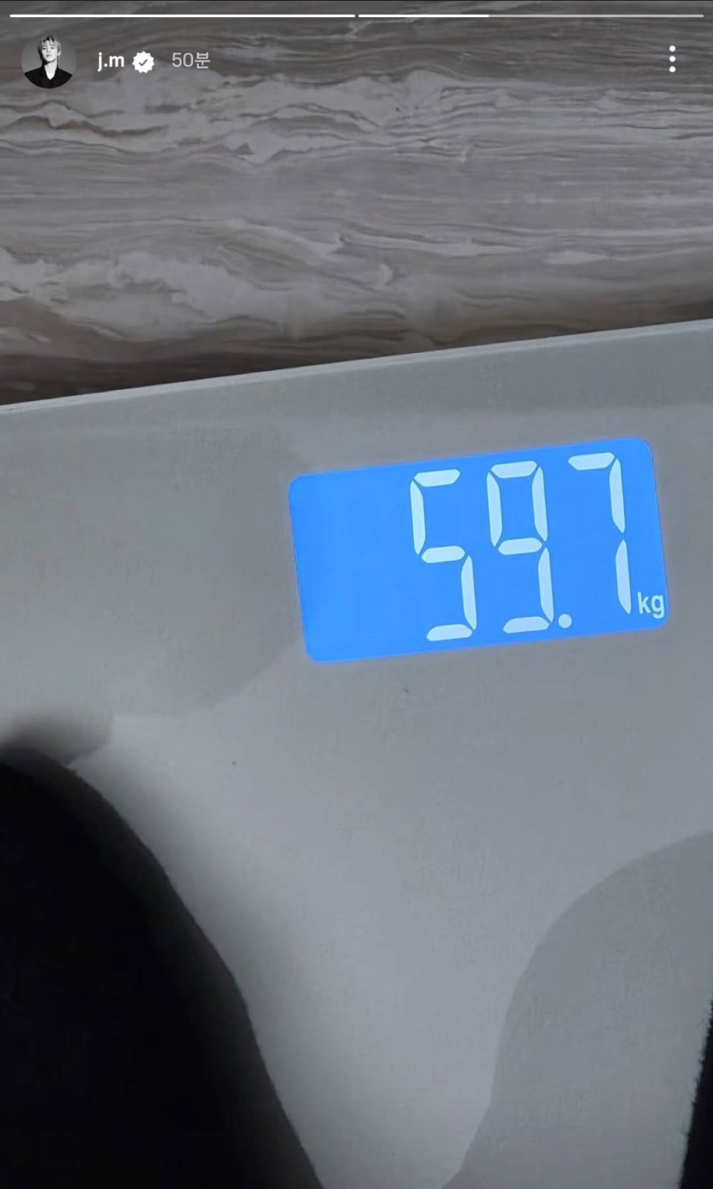 On March 25 KST, Jimin posted a photo of himself standing on a scale via social media. The image showed his weight at 59.7kg.
