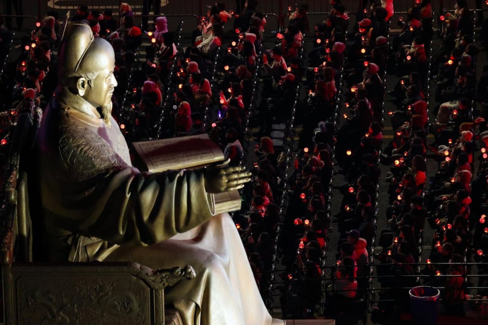 The highlight of the night came with the title track “SWIM.” As the performance began, Gwanghwamun Square was bathed in blue light, matching the song’s fluid, pop-inspired mood. The choreography emphasized smooth, wave-like movements, creating a visually immersive experience.