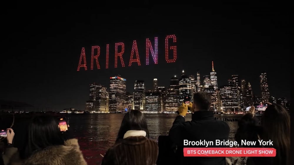 London’s iconic London Eye was illuminated in striking red lights, creating a spectacular scene. Nearby building facades displayed media art featuring the members holding traditional lanterns alongside the album logo. In New York, drones performed synchronized formations against the Manhattan skyline, lighting up the night sky with phrases such as “NEW YORK, WHAT IS YOUR LOVE SONG?”, “ARIRANG”, as well as the group name BTS and the number “7,” symbolizing the seven members. Hundreds of drones also formed the Big Dipper constellation.