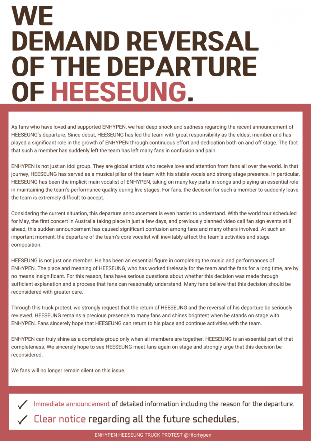 On March 11 KST, a number of fans revealed through social media that they are preparing a truck protest demanding Heeseung’s return to the group. Fans also released a statement addressed to the group’s agency Belift Lab, urging the company to reconsider the decision.