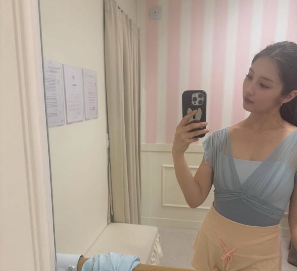 In the revealed photo, she wore a sky-blue leotard paired with peach-colored shorts, highlighting her toned and slim physique with no excess body fat. Her elegant posture, shaped through years of dance training, and her healthy, well-defined body line were enough to draw admiration.