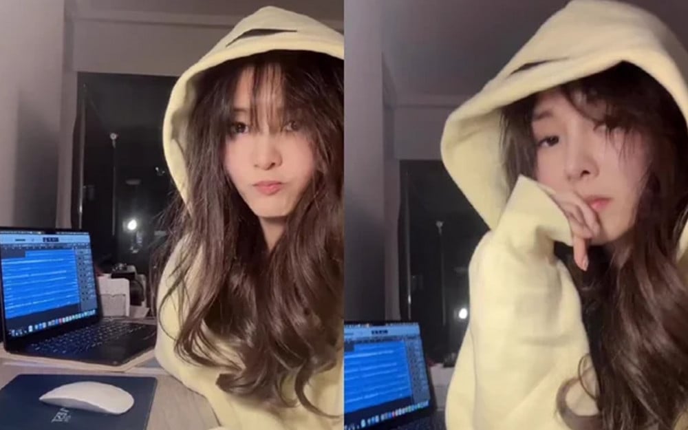 In the video, she appears in a relaxed setting, singing casually. A laptop, seemingly being used for music production, sits beside her—hinting that she may be working on new material rather than simply sharing a moment from her routine.