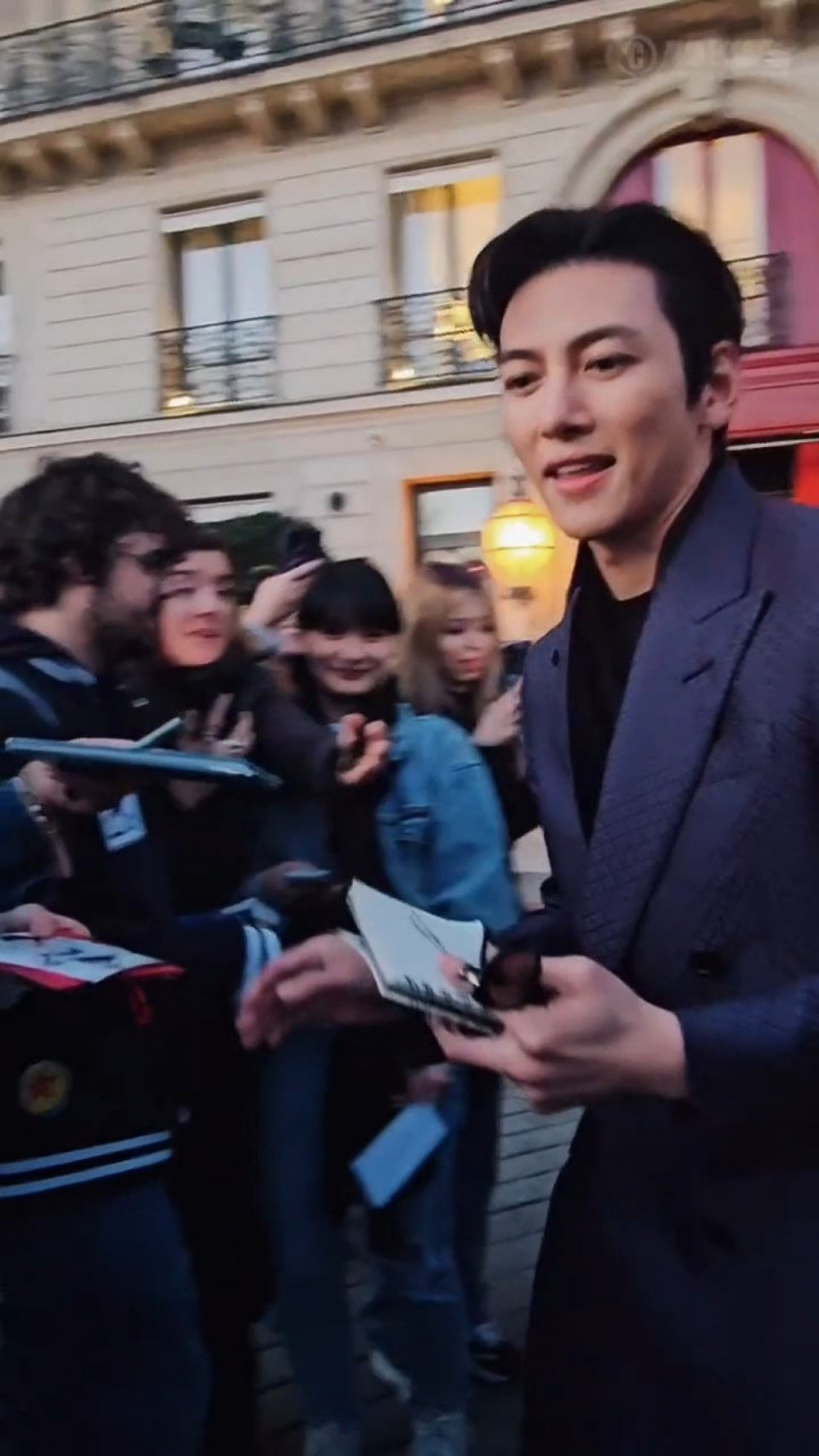 The clip shows Ji Chang Wook greeting fans who were waiting outside the venue of the Tom Ford show during Paris Fashion Week 26 F/W in Paris, France. The actor warmly responded to autograph requests, smiling and signing items for fans.
