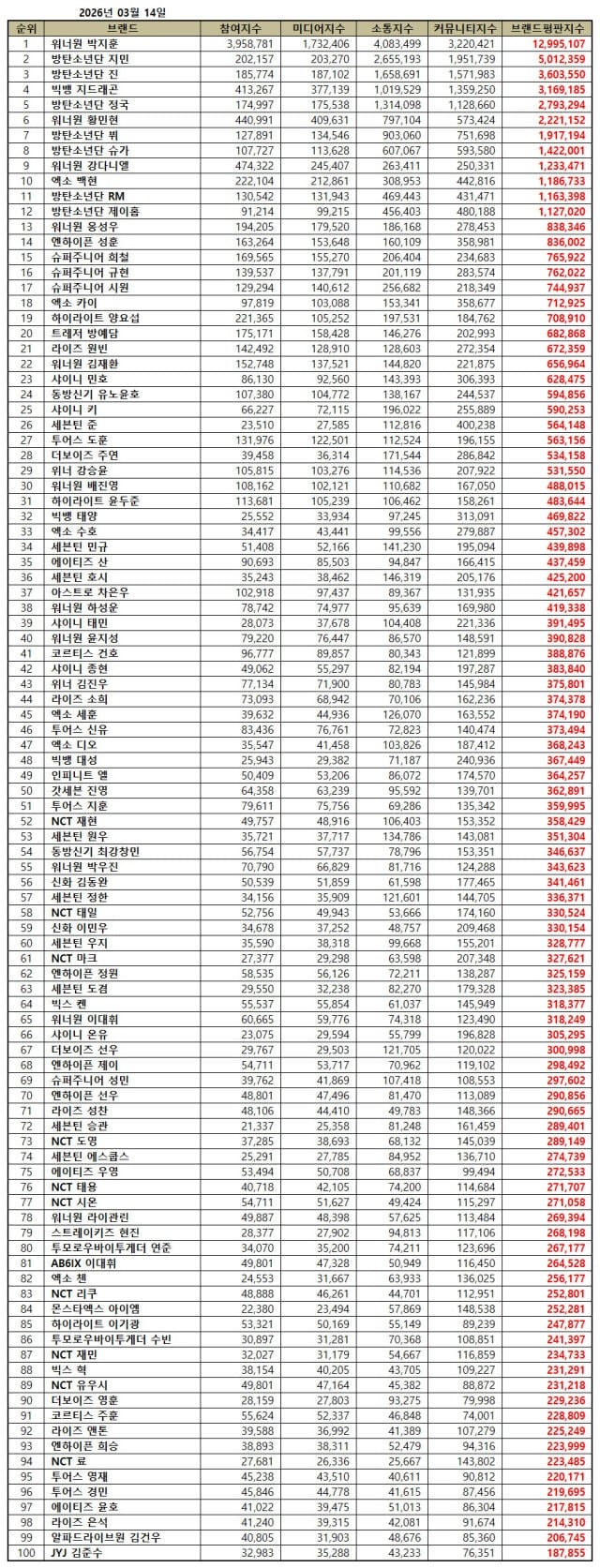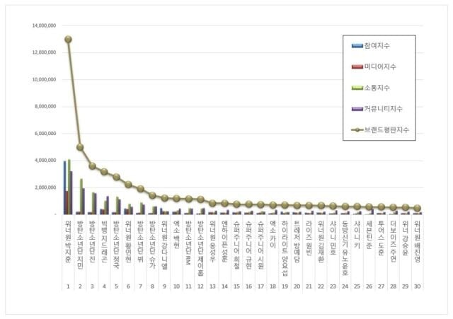 From February 14 through March 14 KST, the Korea Brand Reputation Index analyzed big data of 755 male K-Pop idols in areas including consumer participation, media activity, communication, and community activity. The analysis results found that consumer participation increased by 42.80% from last month, with Park Ji Hoon's individual brand engagement skyrocketing by 3,129.24% from February.