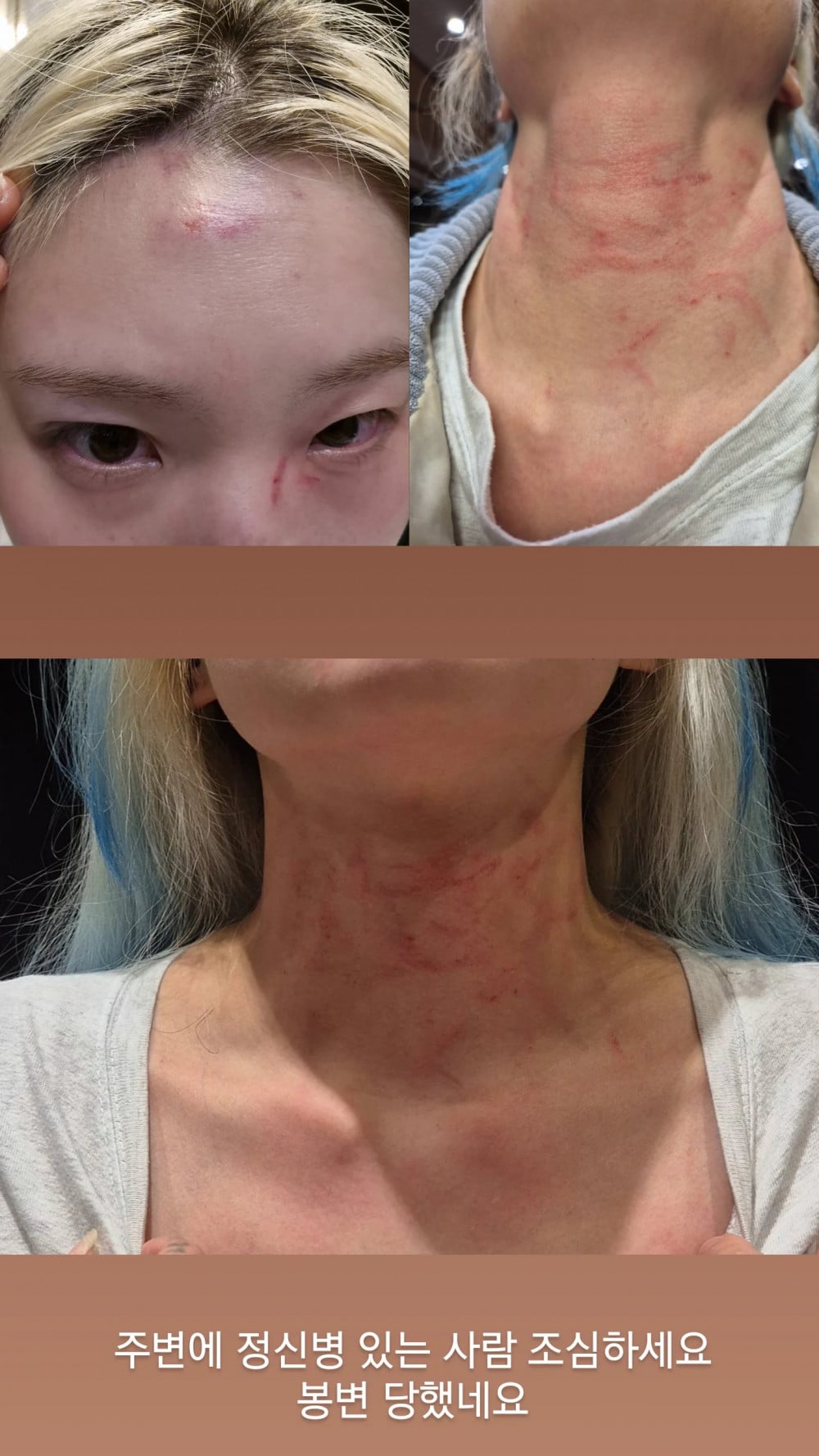 On March 19, fans grew worried when Choi Hyun Jung uploaded a photo revealing scratches on her face and neck. Alongside the image, she wrote, “Please be careful around crazy people. I ended up going through an unpleasant ordeal.”