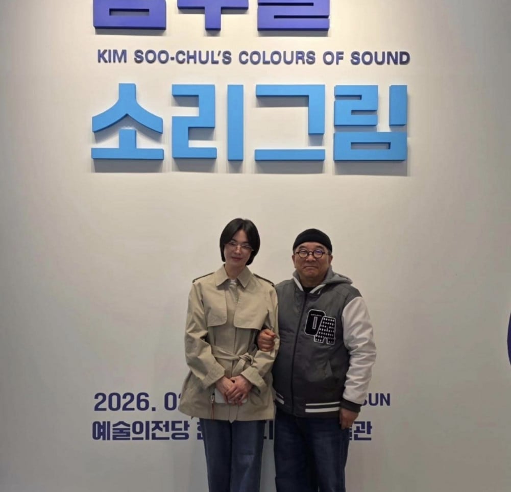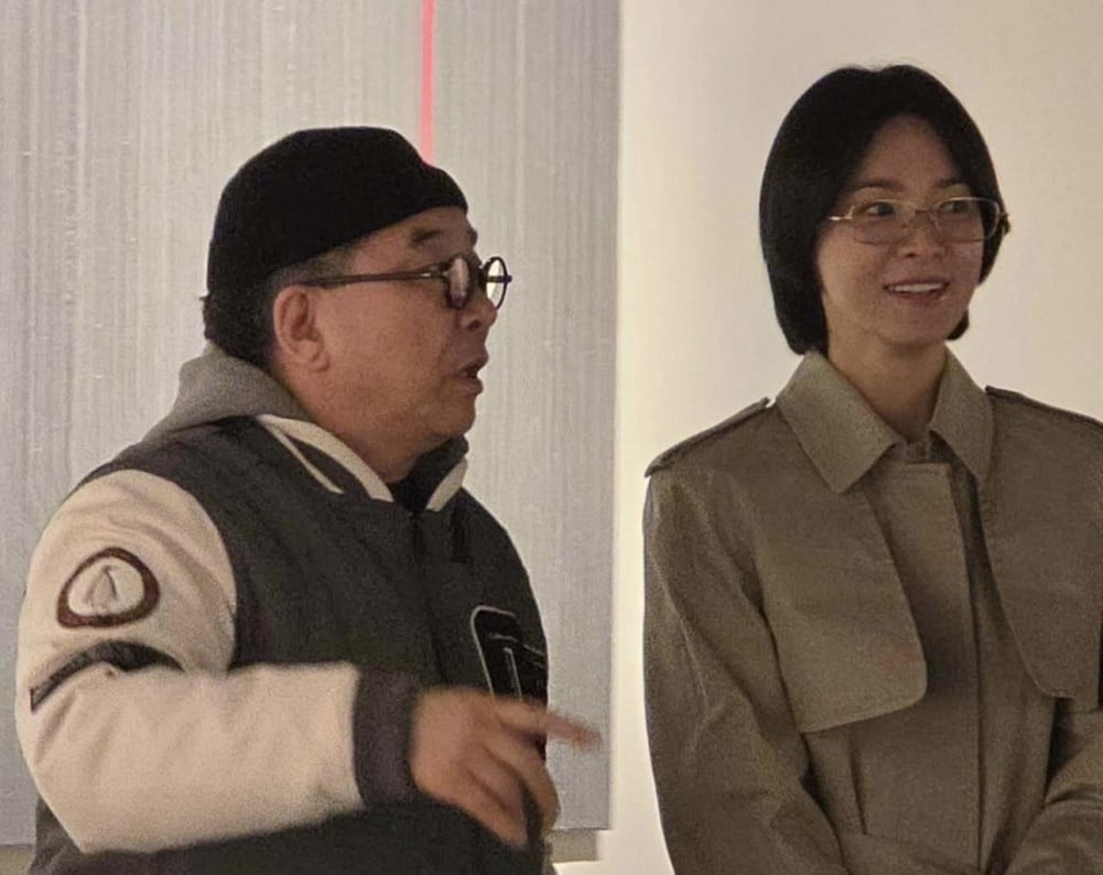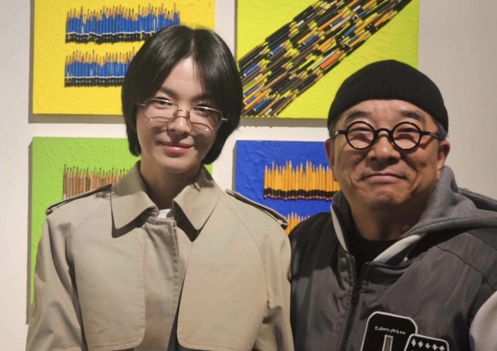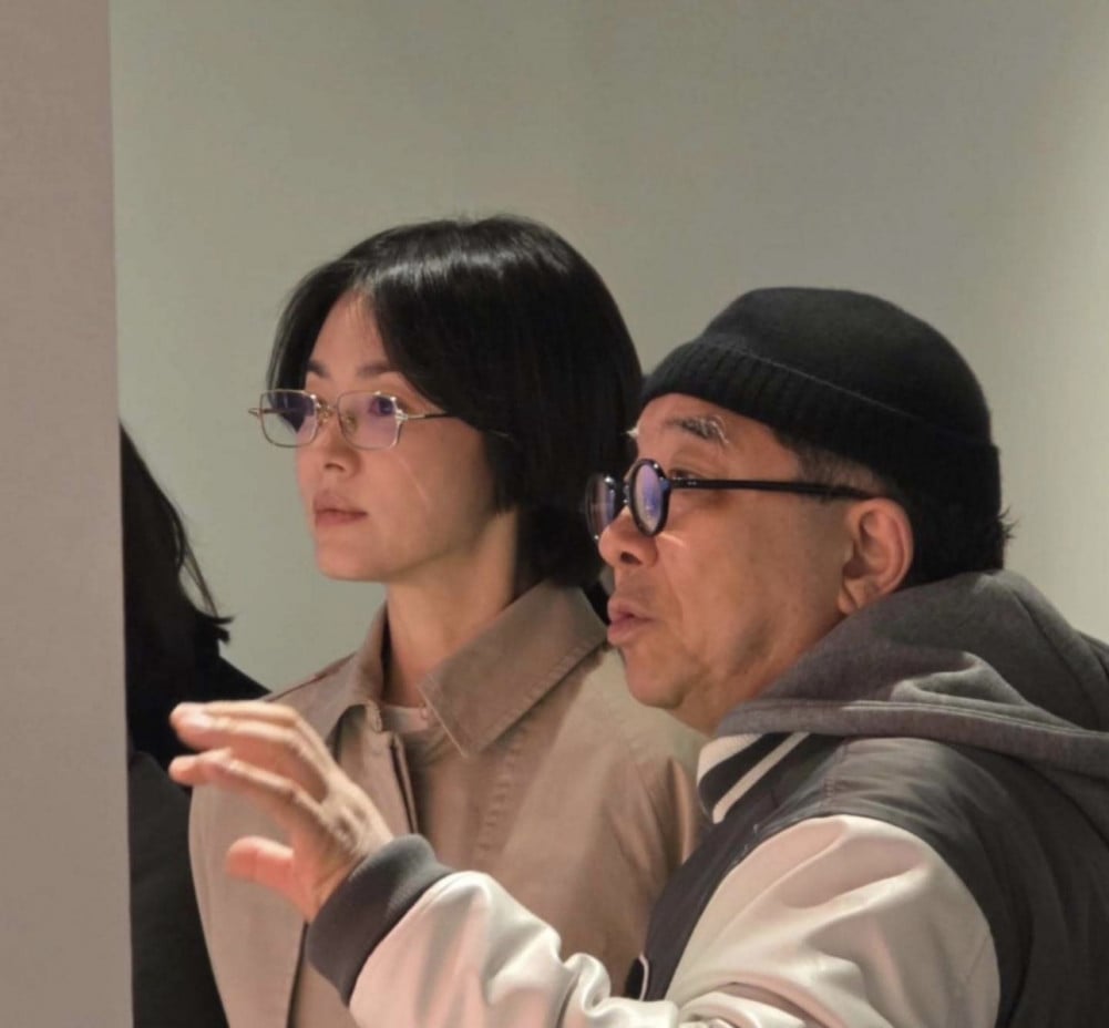 On March 31, singer Kim Soo Chul shared several photos on social media, writing, “I met actress Song Hye Kyo at my exhibition after several years. So nice to see her again.” He added, “She is a junior with a down to earth personality and a kind heart. We had tea together with her companion and manager and shared a lot of laughs,” giving a glimpse into the friendly atmosphere.