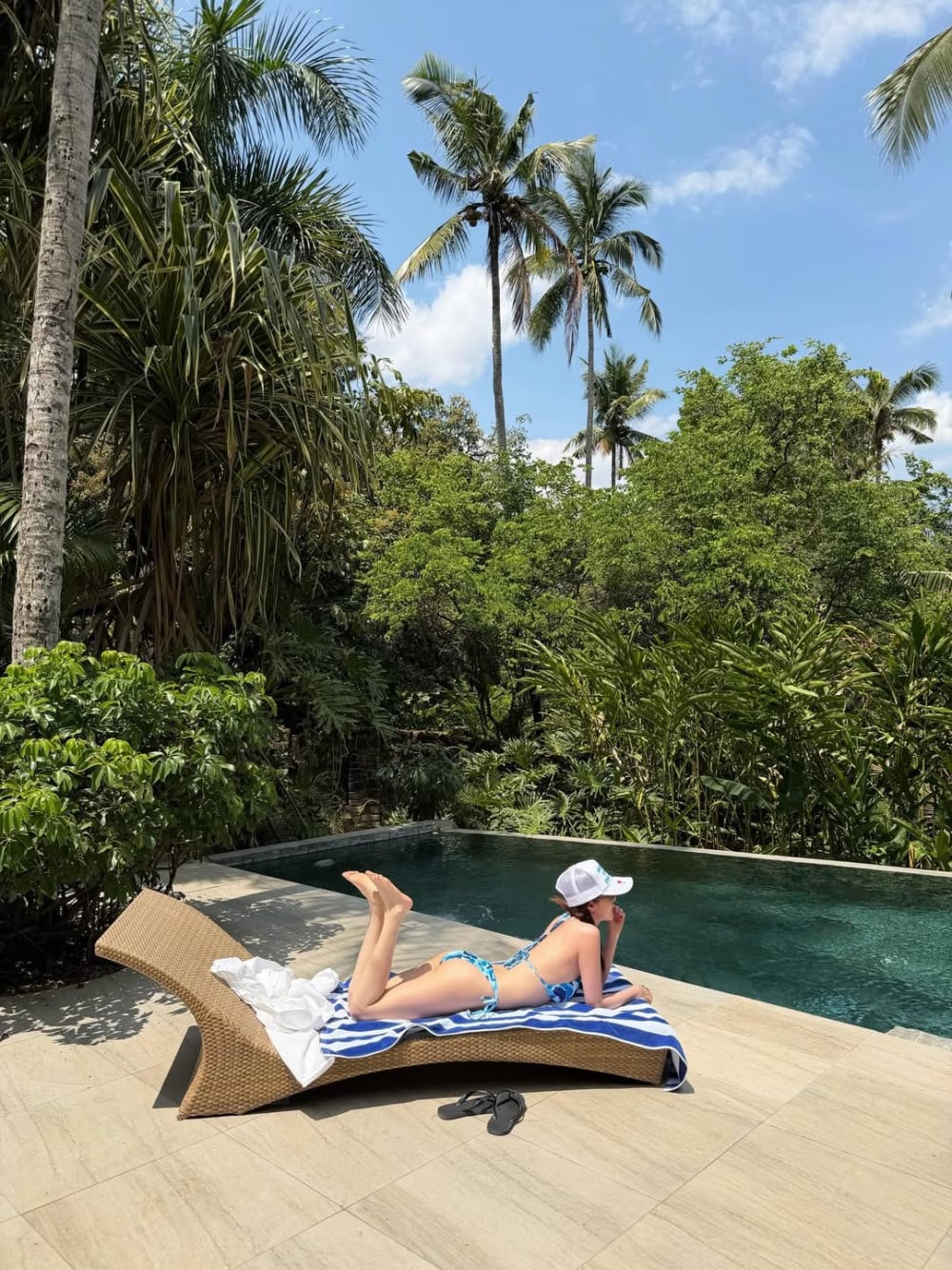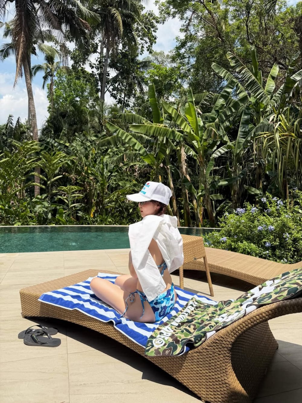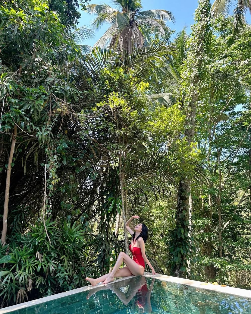 In previous summers, she usually showcased bright and bold looks with orange and red toned hues, but this time, she chose a blue patterned bikini, creating a different atmosphere. The refreshing color tones combined with natural light further emphasize a softer and cooler mood.