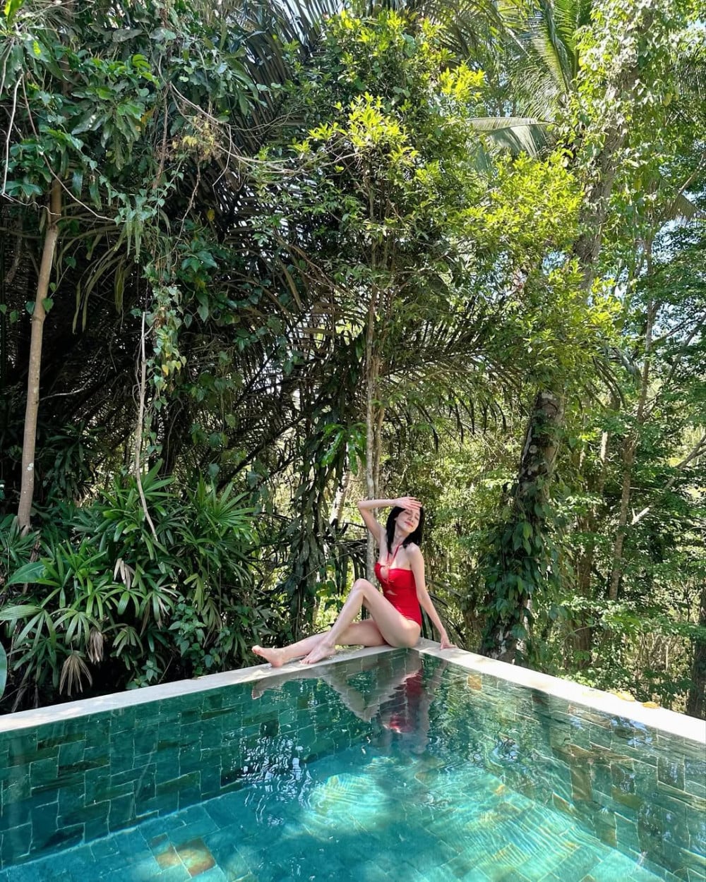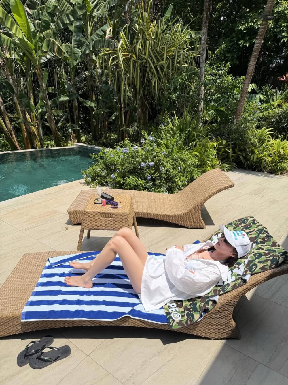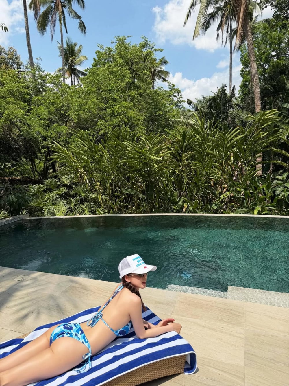 In previous summers, she usually showcased bright and bold looks with orange and red toned hues, but this time, she chose a blue patterned bikini, creating a different atmosphere. The refreshing color tones combined with natural light further emphasize a softer and cooler mood.