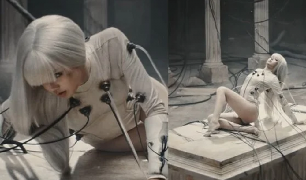 In the video, Lisa departs from her usual pop star image, appearing in a bold, avant-garde concept that evokes an android or a fallen angel. Her transformation is highlighted by long silver hair that falls to her waist, paired with blunt bangs that enhance a doll-like yet cold, futuristic aesthetic.