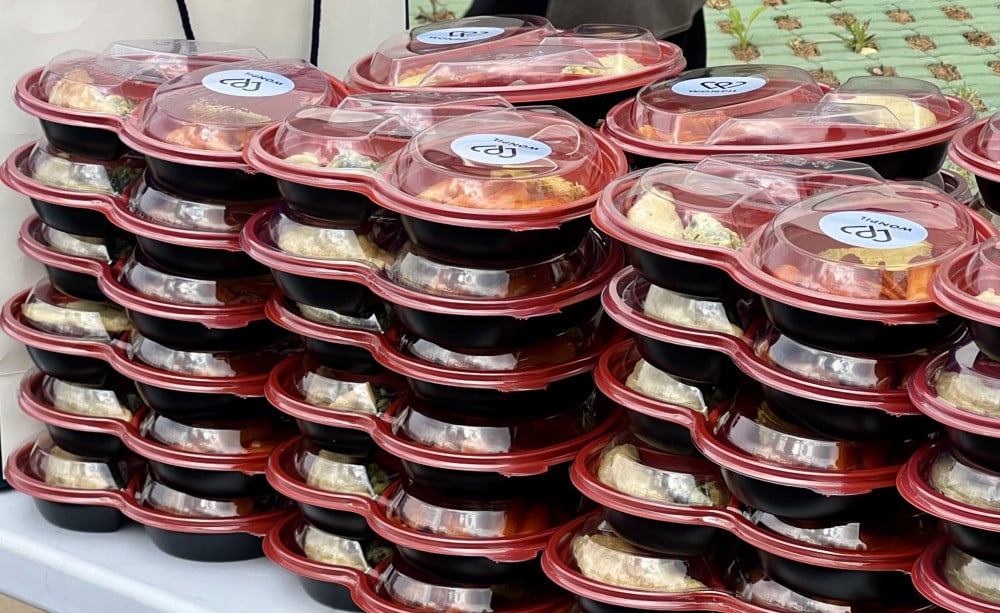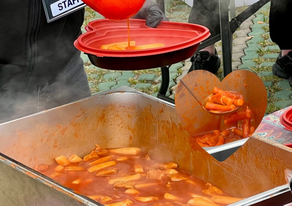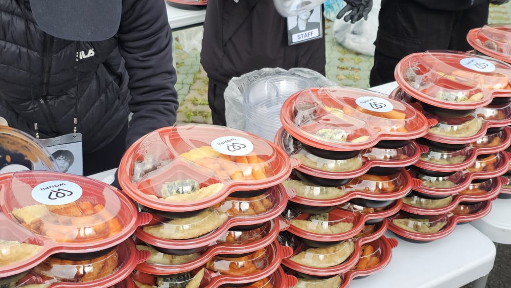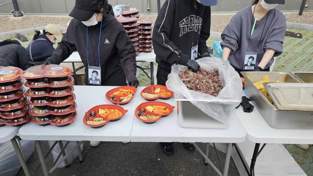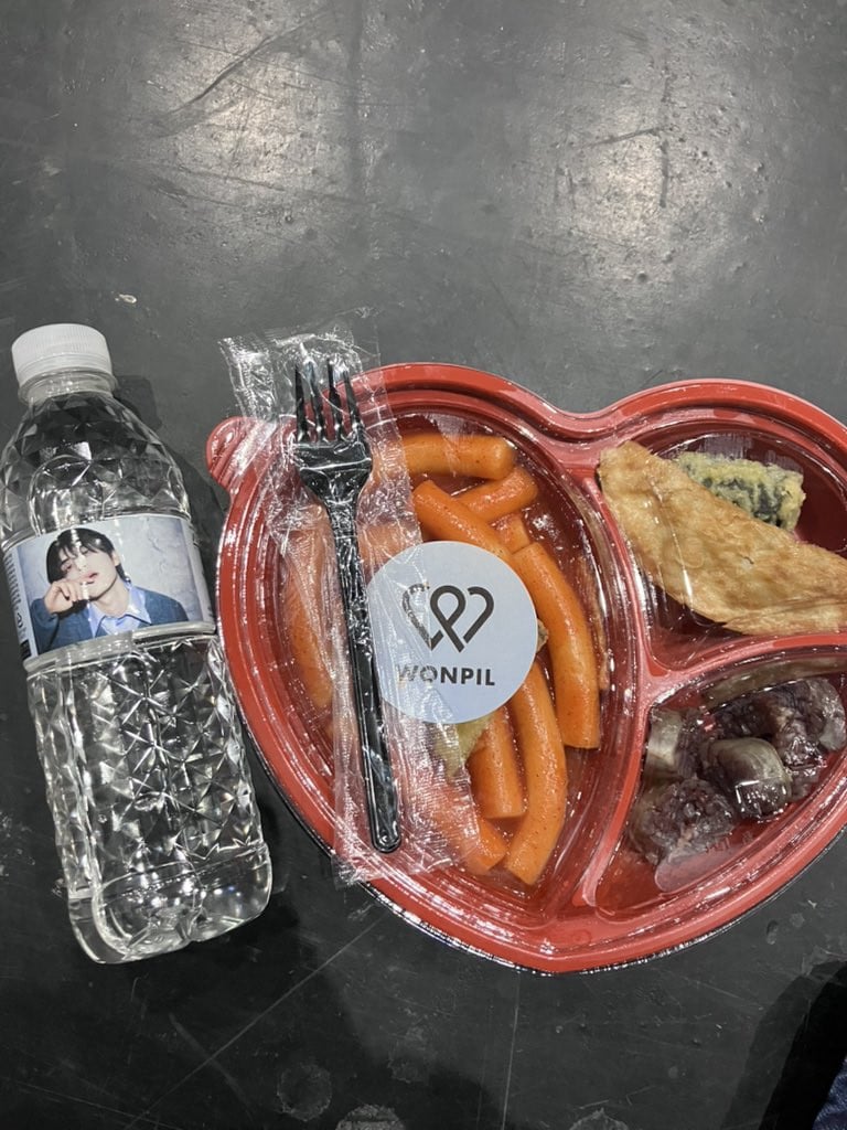 At no cost, fans at the event were each given a lunch box filled with tteokbokki (spicy rice cakes), soondae (steamed blood sausage), and small fried side dishes. Both the box and the complimentary bottle of water also featured Wonpil's sticker.