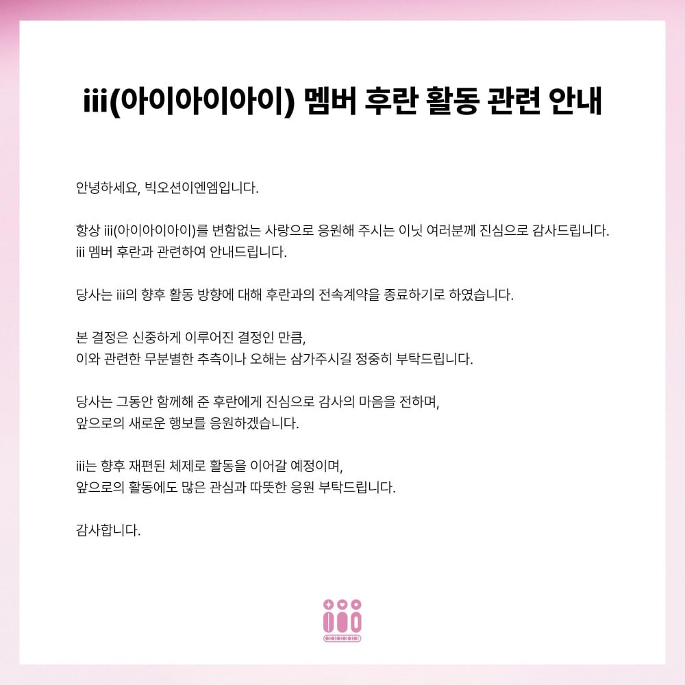 iii is set to continue activities as a restructured unit, and the agency encouraged fans to show continued love and support for the group moving forward.
