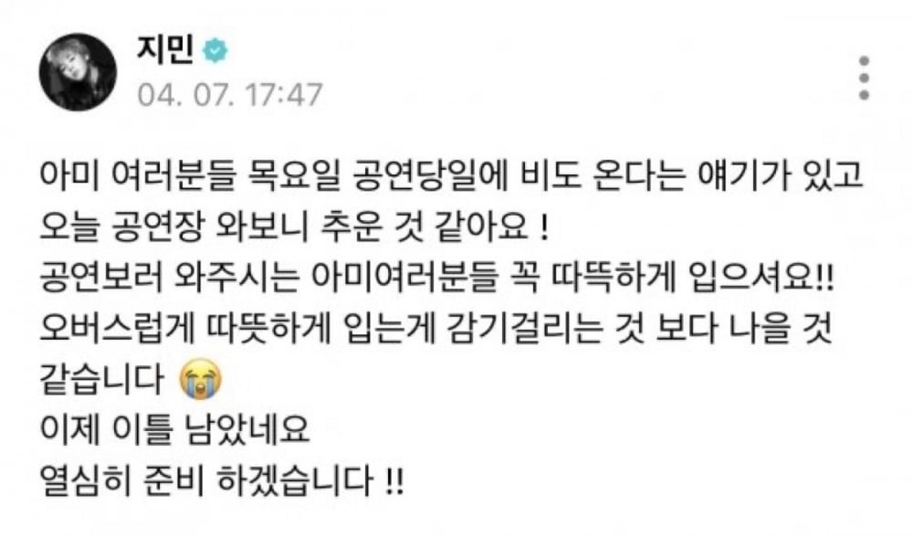 “ARMY who are coming to the concert, please make sure to wear warm clothes,” he wrote, adding that it is better to overdress than risk catching a cold.
