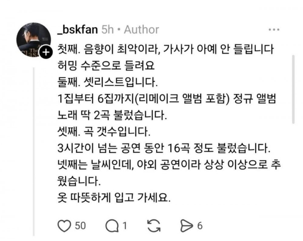 The setlist also became a topic of disappointment. Despite a discography spanning multiple full length albums, only two songs from his main albums (including remake works) were performed, according to attendees. Longtime fans in particular expressed regret over the heavy focus on newer material.