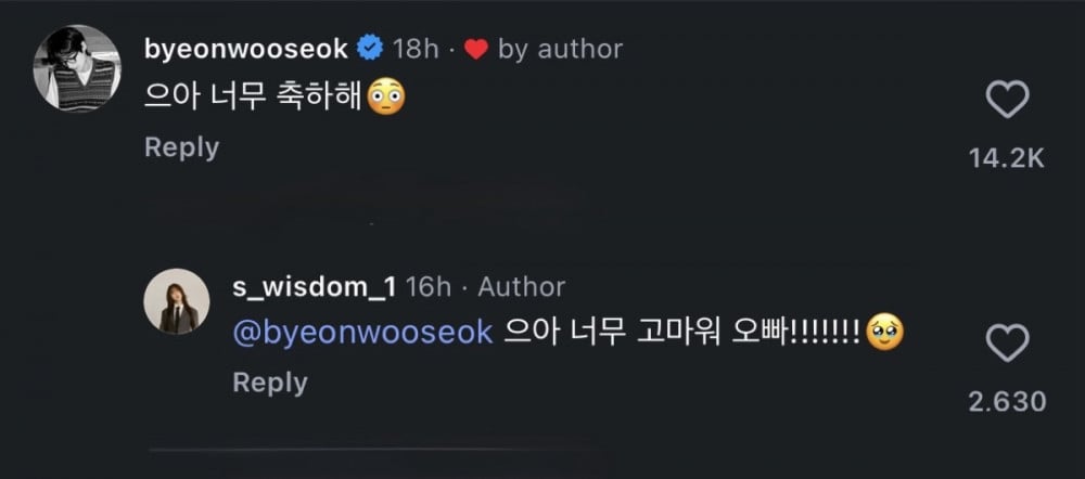 Byeon Woo Seok wrote, “Wow, congratulations,” while Heo Hyung Gyu, who played a villain in the drama, also commented, “Congratulations so much,” expressing his support.
