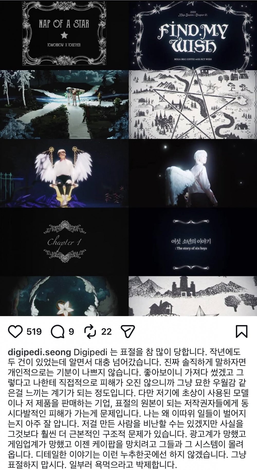 "Our work at Digipedi gets plagiarized a lot. There were two cases just last year, but we let them slide. If I'm being honest, it doesn't actually make me that upset. They must have borrowed from our work because they liked what they saw, and the plagiarism doesn't affect me directly, so in a way, it actually made me feel kind of superior. However, when the work involves models whose images are copyrighted, commercial products sold by a business, and copyright holders who have registered their original work, it triggers a series of consequences, and that is a problem. Of course, I know exactly why these things happen. Sure, I can stop at criticizing the person or group who committed the plagiarism. But the problem is more fundamental than that. The advertisement industry is on the decline, the gaming industry is following suit, and now, they want to bring K-Pop down with it. I won't bore you with the finer details here in this shabby little space. Let's just not plagiarize. Let's start there. I am publicizing this here for all to see so that those responsible will actually feel ashamed."