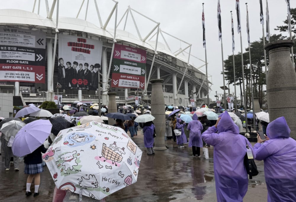 On the rainy afternoon of April 9, the area around Goyang Stadium, where BTS held their concert, was filled with purple. ARMYs, the official BTS fandom, waved purple umbrellas and wore purple raincoats, creating a vivid violet spectacle.
