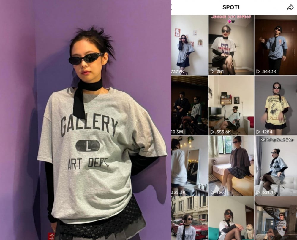 Jennie Kim recently dropped her new song Spot with Korean rapper and songwriter, Zico. In the behind-the-scenes snippet from recording, she wore an oversized grey t-shirt over a long-sleeved black sheer top, paired with a grey mini-skirt and black shoes with long white socks. She completed her look with a messy bun, black sunglasses, and a plain black twilly scarf tied around her neck. Her look went viral on TikTok, with many influencers recreating her style.