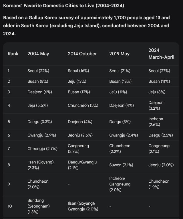 According to a Gallup Korea survey conducted from March 22 to April 5, 2024, among 1,777 people aged 13 and older (excluding Jeju), Seoul was the most desired city to live in, with 27% of open-ended responses. Busan followed with 11%, Jeju came in third at 8%, and Daejeon (3.2%), Incheon (2.6%), Daegu (2.5%), Gangneung (2.1%), Jeonju (2.0%), Chuncheon, and Gwangju (both 1.9%) rounded out the top 10.