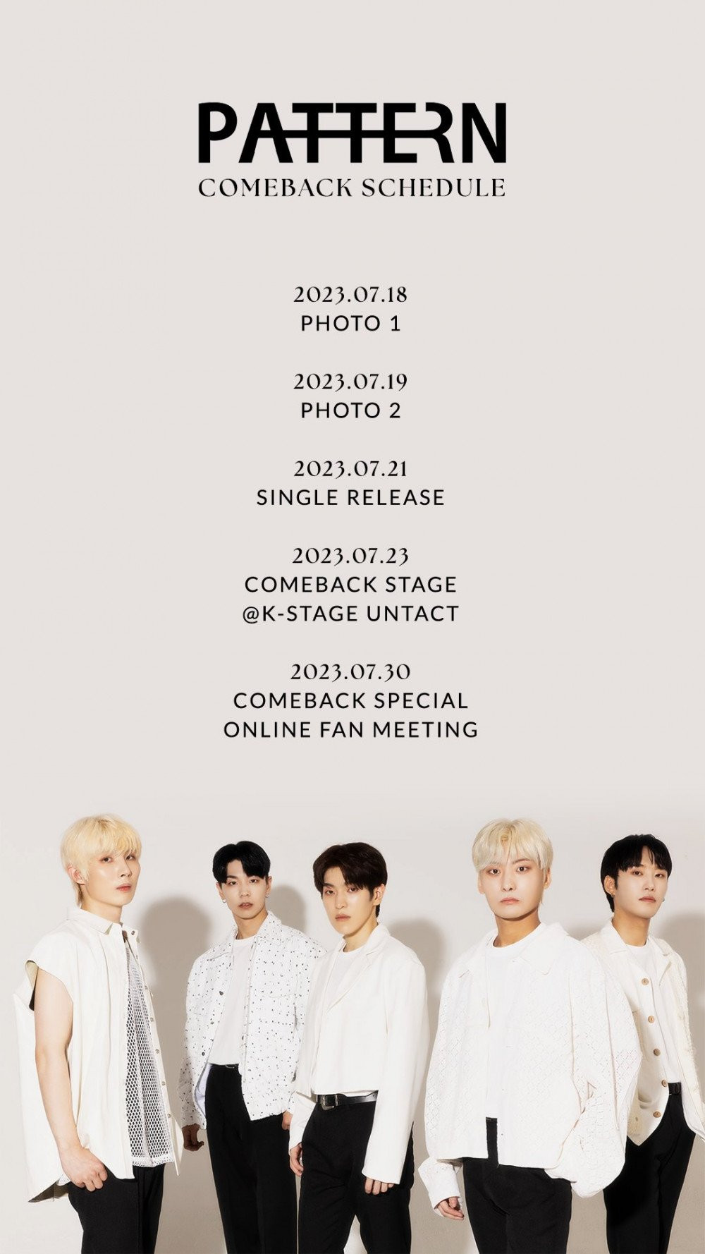 Pattern (패턴) is a five-member boy group under S.I.E.T.E Entertainment. They debuted on November 23, 2018, with their first single album, "Last Stage." The group consists of current members Jinu, Koon, JJ, Kyo, and Haemin.