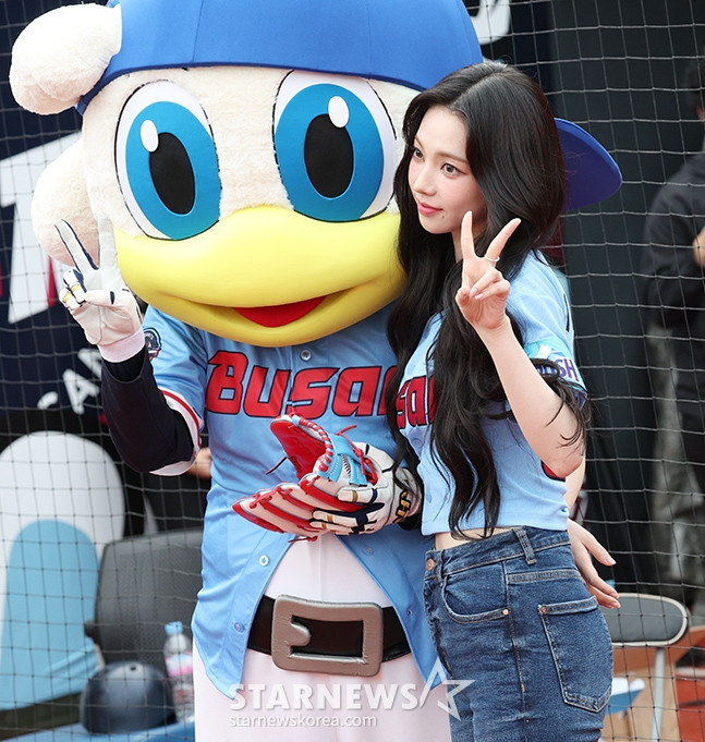 Previously thought to be cancelled due to conflicting schedules, aespa's Karina makes it in time for a celebratory pitch at the Lotte Giants baseball game.