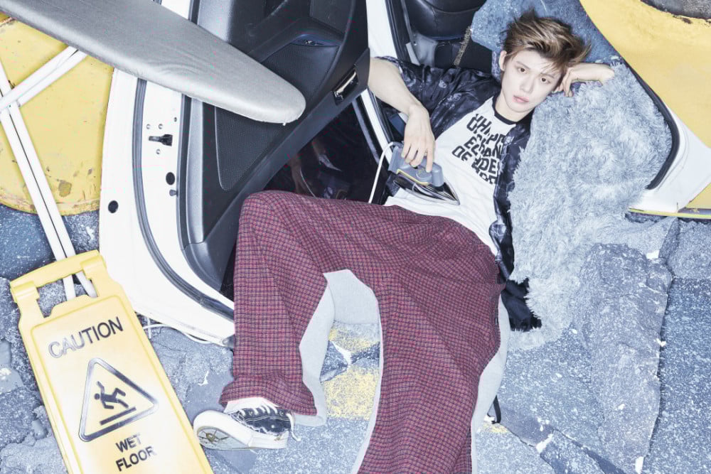 The 'HUNGER' version depicts a primal hunger following a storm, contrasting with the trapped imagery of the 'THORN' version. The background features cracked ground and overturned cars to indicate the aftermath of a storm, while yellow thorns piercing the asphalt add a fantasy element. Despite the chaotic setting, members Yeonjun, Soobin, Beomgyu, Taehyun, and Hueningkai are shown in casual attire with refreshing visuals. The photos include Soobin with a shopping basket, Yeonjun leaning on a damaged car, Beomgyu throwing fruit, Taehyun eating cereal, and Hueningkai sitting on an overturned vehicle with a blank expression.