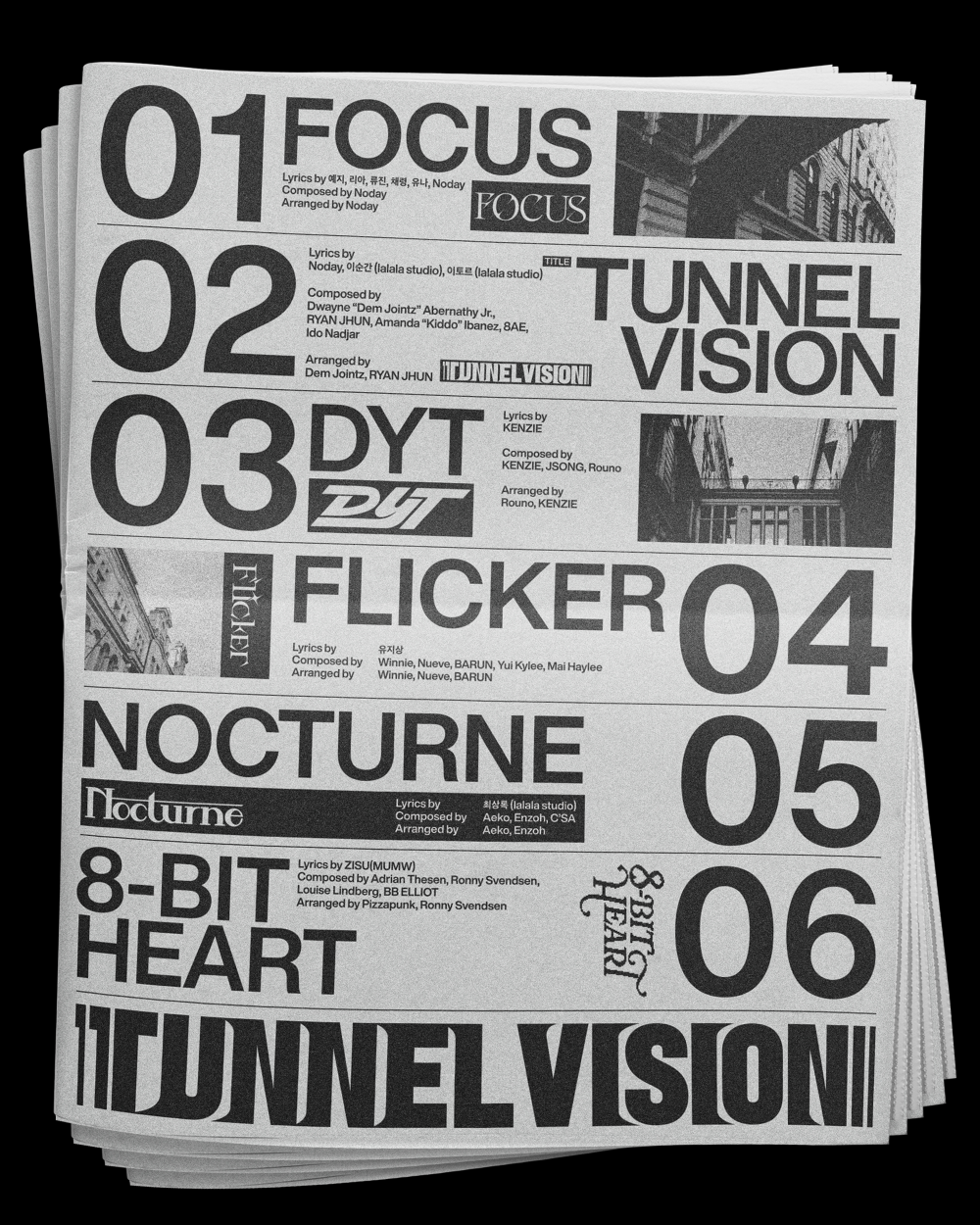 Based on the teasers released, the upcoming album 'Tunnet Vision' includes 6 tracks - "Focus," "Tunnel Vision," "DYT," "Flicker," "Nocturne," and "8-Bit Heart."